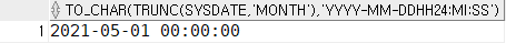 SELECT TO_CHAR(TRUNC(SYSDATE, 'MONTH'), 'YYYY-MM-DD hh24:MI:SS') FROM DUAL;