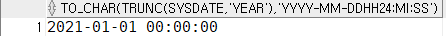 SELECT TO_CHAR(TRUNC(SYSDATE, 'YEAR'), 'YYYY-MM-DD hh24:MI:SS') FROM DUAL;